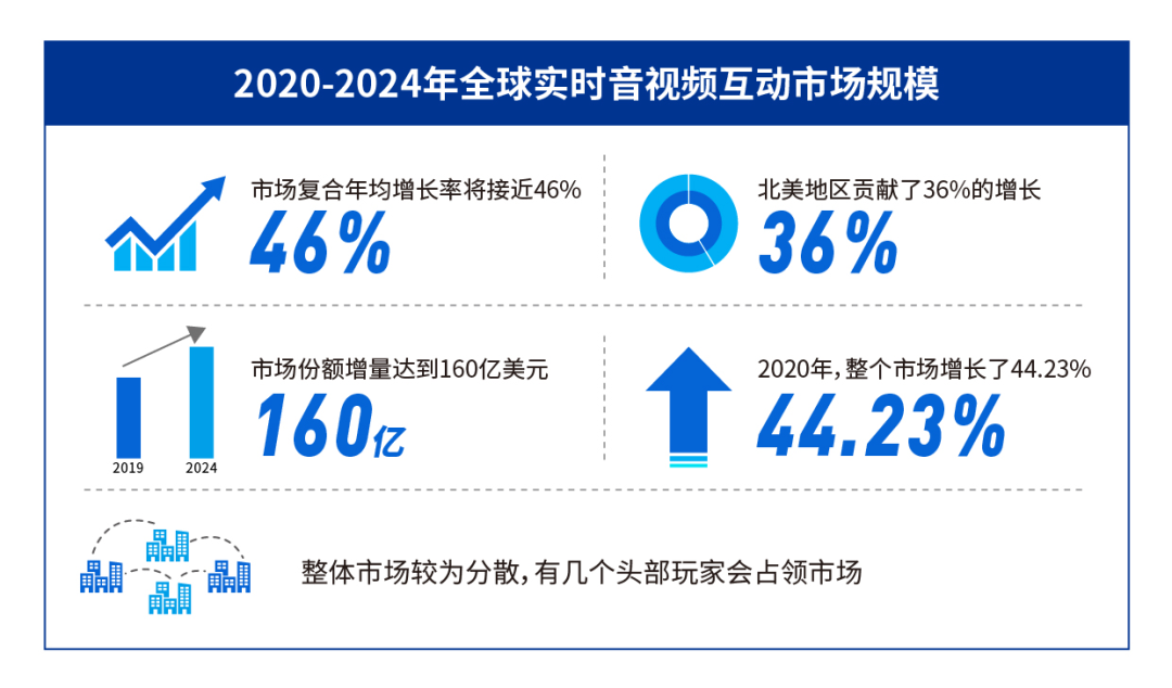 根据全球顶级的顾问公司Techavio预测,2020~2024年,全球网页即时通信( WebRTC )市场份额增量将达到160 亿美元,年均复合增长率超过 46% 。