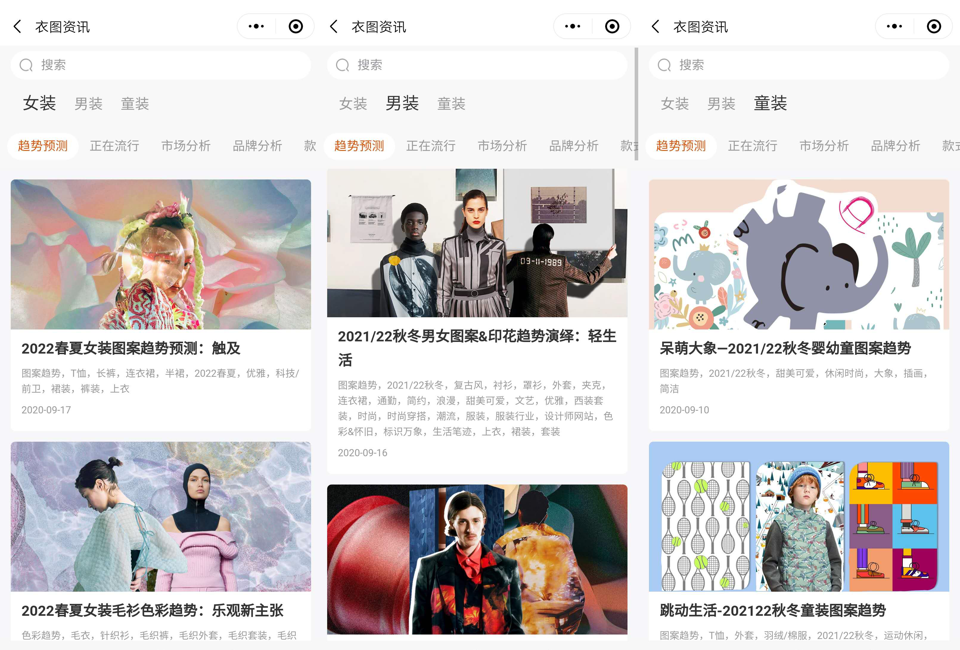 “衣图资讯”内容由衣图趋势网提供,包含男装、女装、童装三大版块,每个栏目下设八大栏目。其中包含《趋势预测》、《正在流行》、《市场分析》、《品牌分析》等趋势报告,《款式成册》、《款式单张》、《图案》等时尚素材,以及《时尚穿搭》的时尚资讯。