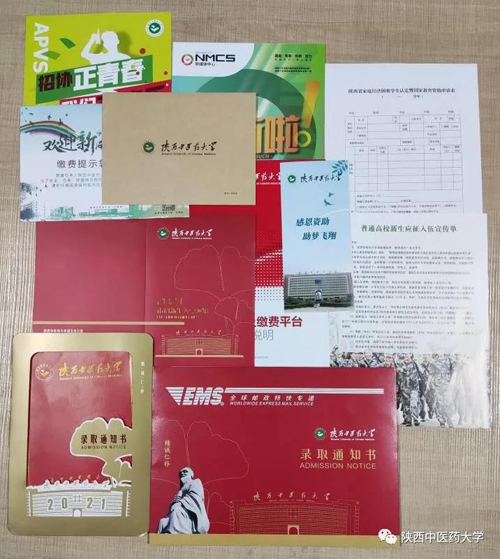 录取通知书外包装为该校自主设计图片,不含任何广告,录取通知书EMS内包括:录取通知书、2021新生入学须知、陕西中医药大学资助手册、陕西省家庭经济困难学生认定暨国家教育资助申请表、普通高校新生应征入伍宣传单、迎新系统及缴费平台操作说明、缴费提示袋、2021级新生纪念、陕西中医药大学新媒体中心介绍、招生宣传志愿者协会介绍。