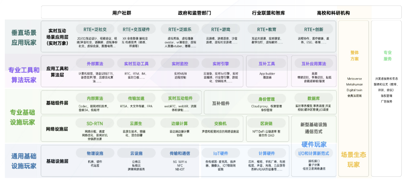 除了场景化的分析,报告中根据行业生态结构,将实时互动行业分为通用基础设施玩家、硬件玩家、专业基础设施玩家、专业工具和算法玩家、垂直场景应用玩家和场景生态玩家六大类。这五个层次依次序向上,每一层形成上一层的技术支撑,最终对行业生态里的终端用户、政府和监管部门、行业联盟和智库、高校和科研机构形成价值。