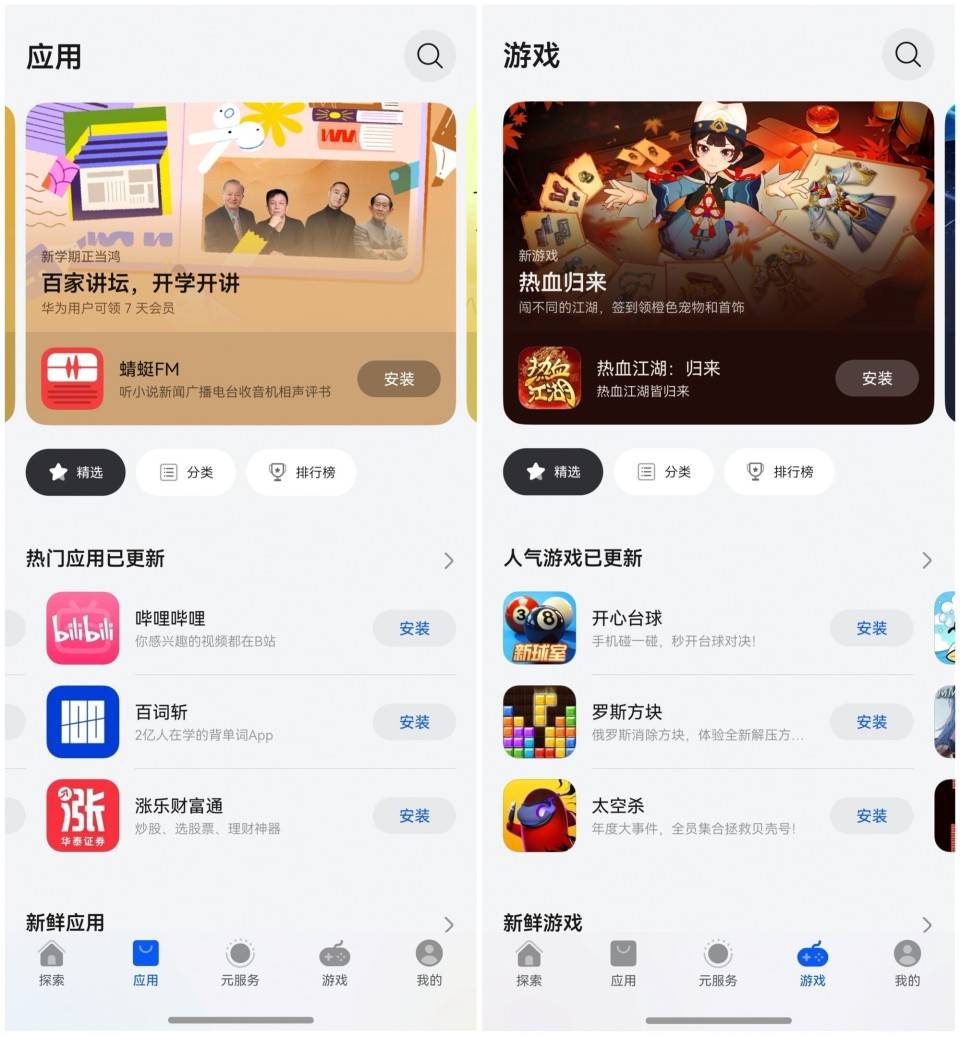 除了直接搜索应用,你还可以在“应用”和“游戏”页探索,顶部是编辑为你推荐的近期重磅更新、游戏新内容、热播影音、限时活动等内容及App卡片,横向滑动浏览;腰部的“精选”包含时下热门应用和游戏;“分类”页面中可以探索更多同类应用;新增的“排行榜”类别,可以用“下载榜”看人气,“口碑榜”感受评价,发现好评应用!
