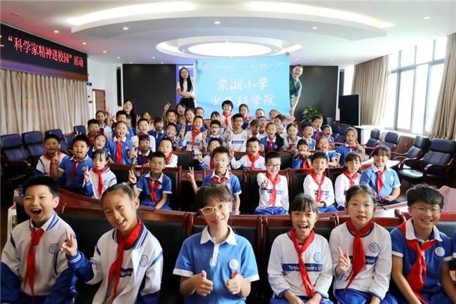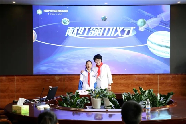 在讲座正式开启前,学校特别安排了献红领巾仪式。鲜红的领巾不仅是少先队员的象征,更承载着棠湖小学师生对航天专家的崇高敬意。献红领巾仪式结束后,师生与周老师共同合影,用镜头定格下这一庄重而有意义的瞬间,也为本次科技活动奠定了温暖的基调。