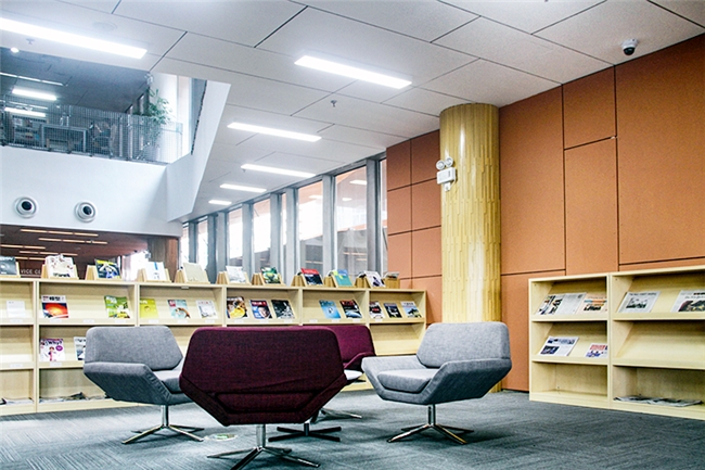 该校图书馆设有三层功能空间,包含书刊借阅、数字媒体空间及封闭式讨论间等,总建筑面积达一万平方米,可容纳藏书 38 万册。图书馆的学科资源建设以世界一流学科为标杆,并荣获 2016 年 THEPLAN 文化建筑荣誉奖。