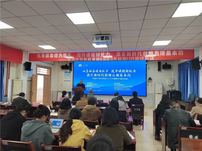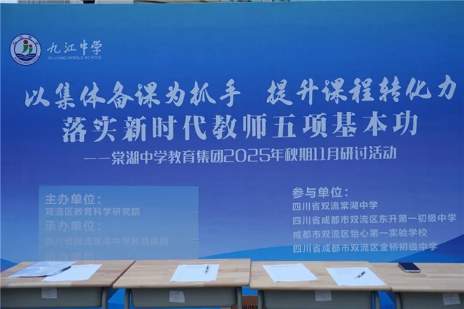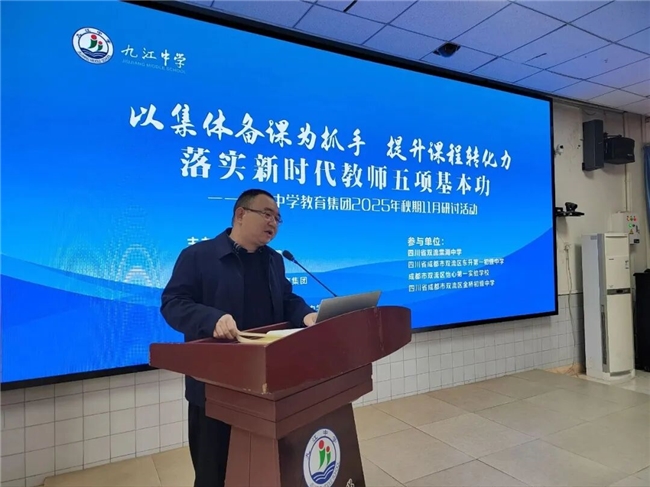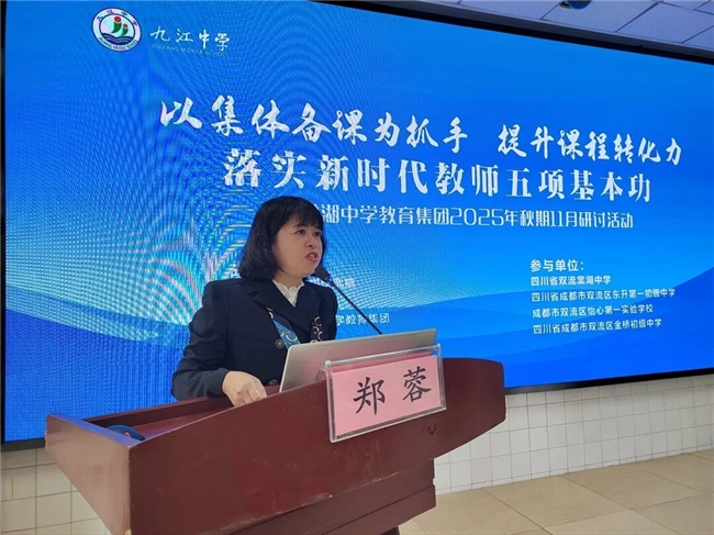 2025年11月11日上午,棠湖中学教育集团“以集体备课为抓手、提升课程转化力,落实五项基本功”专题教研活动在双流区九江初级中学电教室举行,活动历时4小时,特邀四川省教科院义务教育研究所所长何立新、双流区教科院初中室主任李志江参与指导,双流区棠中教育集团下的棠湖中学、东升一中、金桥初中、怡心第一实验中学和九江初中等校领导及教师代表齐聚交流,以“实操展示+经验互鉴+专家赋能”的闭环模式,推动集团教研从“形式联动”向“实效共生”升级。