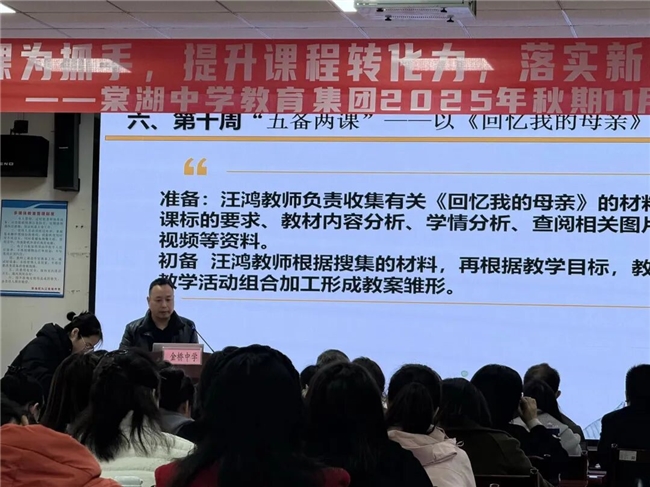 金桥中学以《回忆我的母亲》为例,展示“五备两课”流程——先由教师分工收集课标、学情等资料形成教案雏形,再经集体研讨优化;