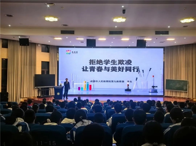 学校特邀成都市人民检察院第九检察部检察官李东担任主讲嘉宾。李检察官以“真实案例+法律条文”相结合的方式,深入浅出地为同学们阐释了学生欺凌的核心定义、主要表现类型以及背后潜藏的严重后果,让大家对校园欺凌有了全面且深刻的认知。