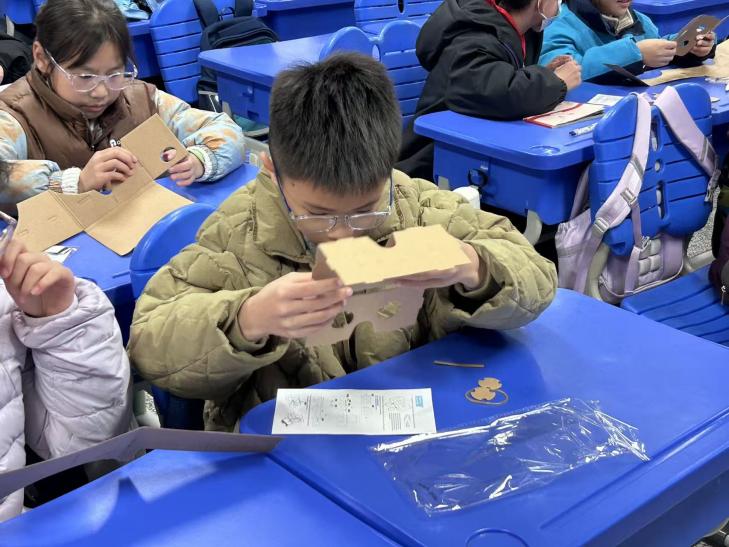 随后进入手工制作环节。在志愿者指导下,同学们分组动手,利用分发的透镜、纸板等材料,精心组装属于自己的简易VR眼镜。从定位镜片到折叠镜框,孩子们全神贯注,在协作中体验从知识到实物的创造过程。当一幅幅立体画面透过亲手制作的眼镜清晰呈现时,现场响起了阵阵惊喜的欢呼。