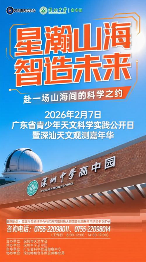 为助力深圳建设全国科普示范城市、推进中小学天文数理教育高质量发展,点燃青少年探索宇宙的好奇心与自主创新热情,由深圳市天文学会主办、深圳中学高中园承办的2026年“广东省青少年天文科学实践公开日”暨深汕天文观测嘉年华,今日正式向全市青少年及家长发出邀约!