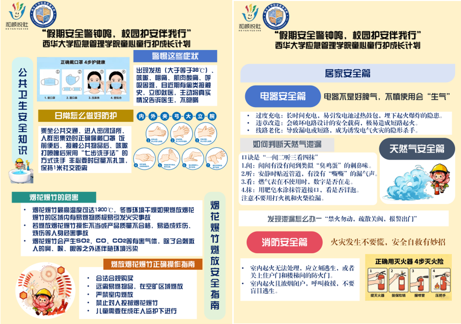 2026年1月16日,西华大学应急管理学院志愿者赴彭州市文翁丹景学校,开展以“假期公共卫生安全、户外燃放烟花爆竹安全及居家安全”为主题的志愿宣讲活动,围绕消防安全、居家隐患与公共卫生等核心内容,通过知识讲授与互动实践相结合的方式,系统普及安全常识,提升学生风险防范与应急处置能力。