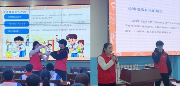 除基础防护知识外,护理系志愿者们结合专业特色,为小学生讲解了基础的应急救护处理知识,通过现场模拟演示、手把手教学的方式,传授简单易懂、可操作的应急处理技巧,帮助小朋友掌握突发情况下的基础自我防范方法,进一步筑牢安全防护根基。