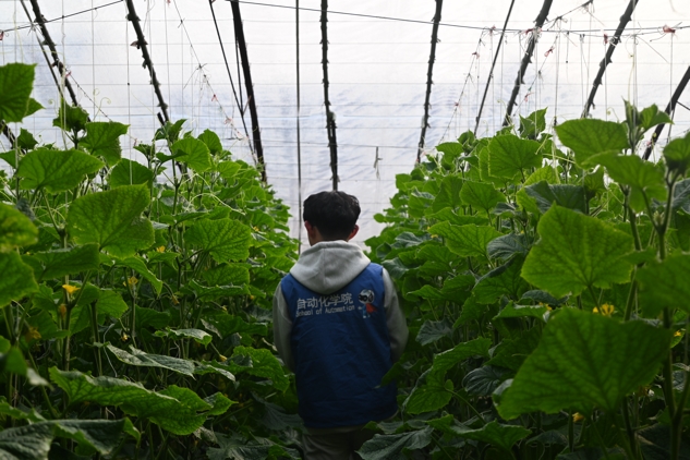 图为实践团成员查看黄瓜长势。武赛供图