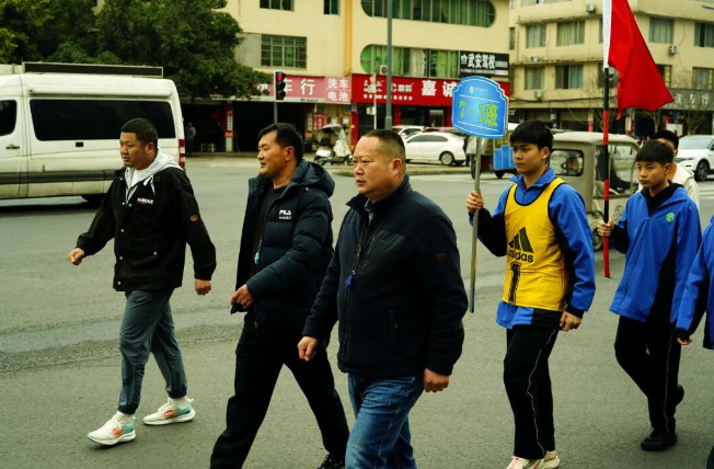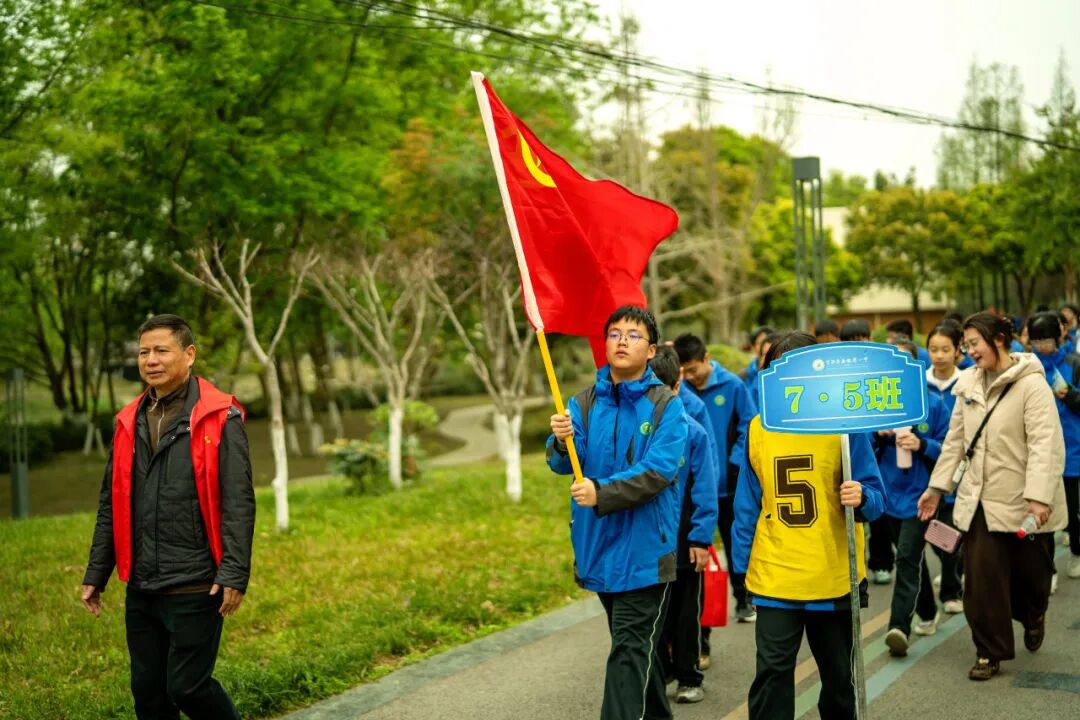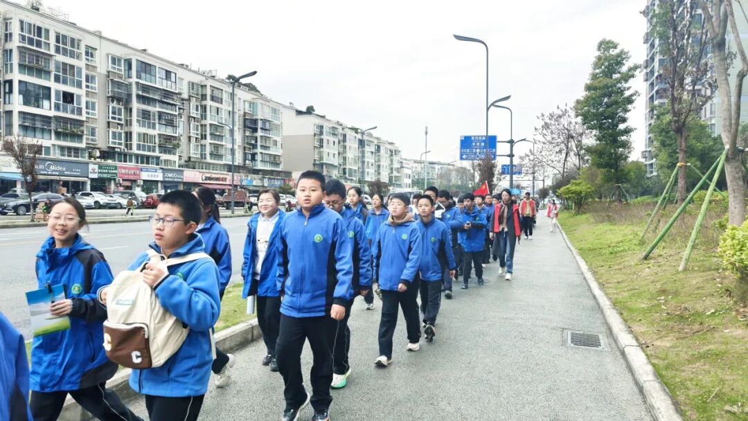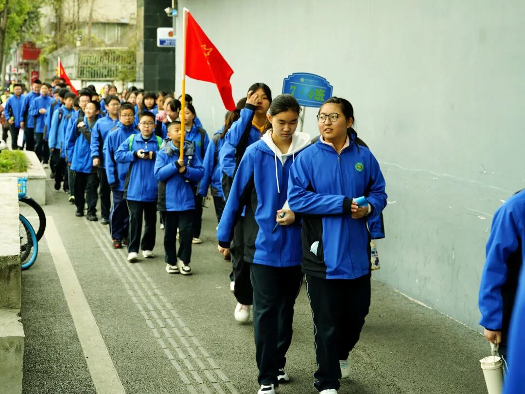 本次活动由学校统筹小组、安全小组、活动小组协同组织,周密制定安全预案、规划行走路线、明确任务分工,确保全程安全有序。上午 9:30,七年级 1—9 班全体同学在操场整齐列队,学校领导强调活动纪律与安全要求后,师生手持班旗,精神饱满地从校园出发,一路徒步前往江安河公园。行进途中,同学们齐唱《中国少年先锋队队歌》,展现出昂扬向上的精神风貌。