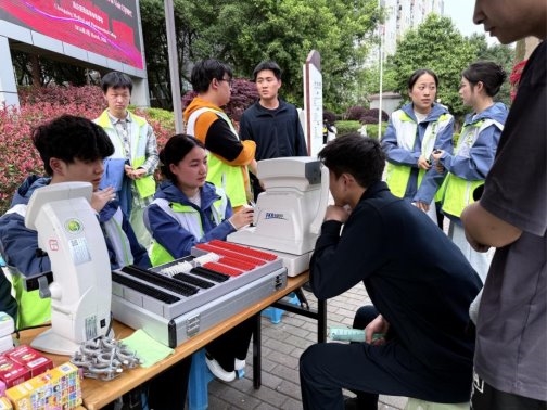 活动现场专门设置标准化眼健康义诊专区,由杨宗发教授眼健康科普工作室统筹指导,下属睛彩护眼服务队志愿者依托我校眼视光技术专业特色优势,全程负责实操服务。志愿者们借助电脑验光仪等专业医疗设备,为往来师生提供免费视力筛查、屈光状态初步检测等服务,耐心细致解读每一份检测报告,结合师生日常学习作息、长期用眼习惯等实际情况,一对一给出个性化近视防控、科学用眼、眼部护理专属建议,引导师生树立早发现、早干预、早保护的护眼意识,用专业所学筑牢校园视力健康防线,用暖心服务守护师生清晰“视”界。