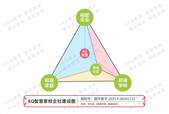 教育的本质是关系的和谐与智慧的启迪。6Q教育创始人刘中良先生基于多年实践研发的“6Q智慧家校企社建设图”(版权号:国作登字-2025-F-00241715),为我们描绘了和谐教育的核心框架。