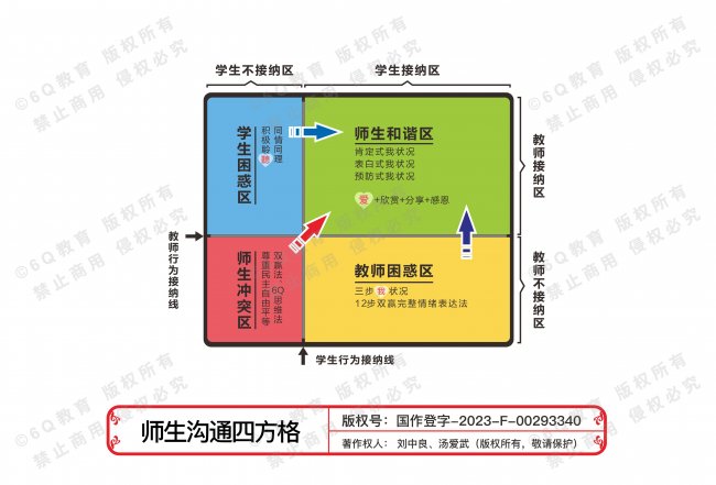 升级后的TOP10万公益项目,可以更广泛地助力教师提高情商智慧,和谐师生关系、家校关系,最终构建和谐校园。其中的核心工具便是由6Q刘中良与6Q汤爱武老师共同研发的“师生沟通四方格”(版权号:国作登字-2023-F-00293340)。这一工具科学解析了师生互动的四种情境,为教师提供了清晰的沟通路径。